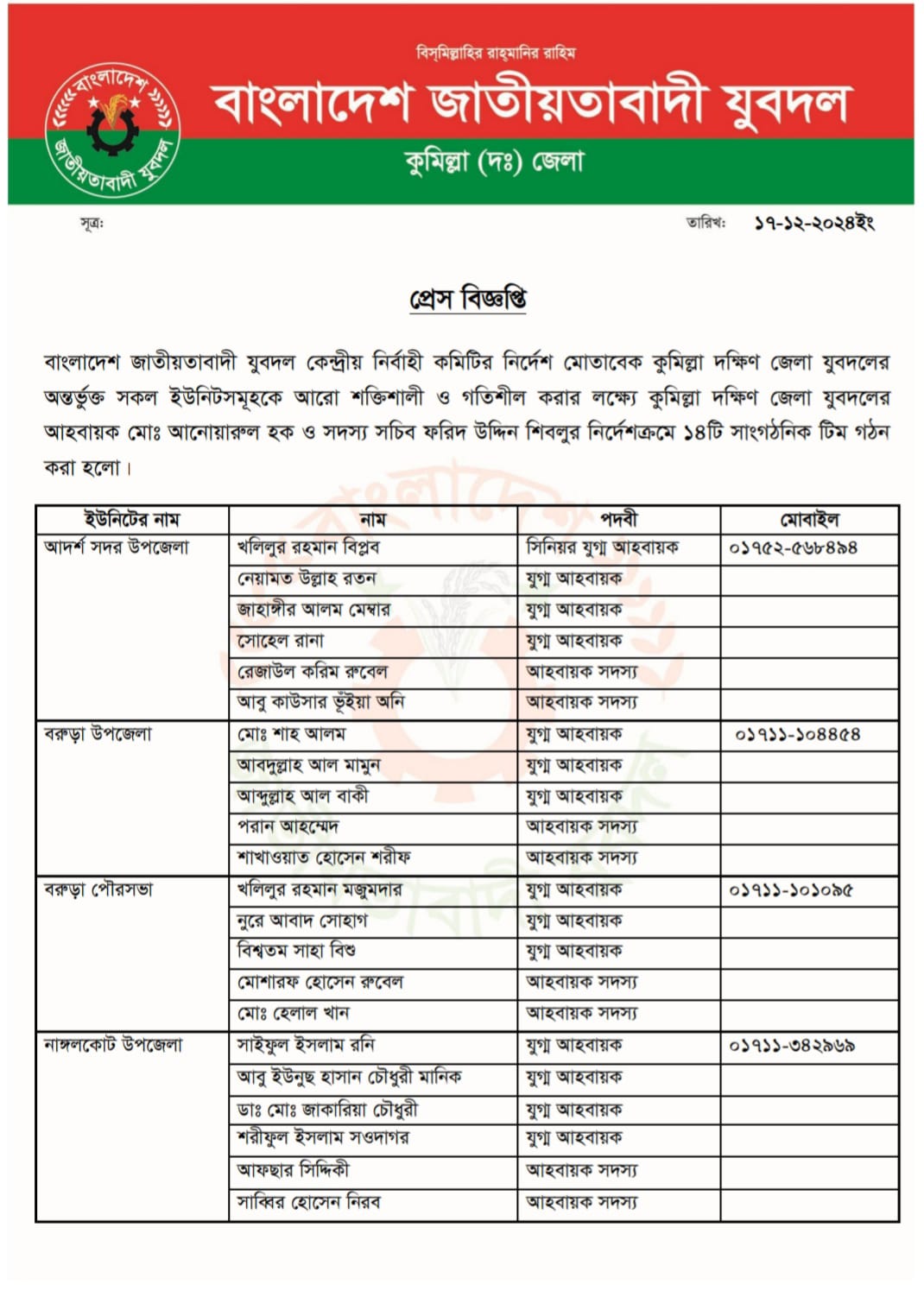 কুমিল্লা দক্ষিণ জেলা যুবদলের যুগ্ম আহবায়ক ( দপ্তরের দায়িত্বপ্রাপ্ত ) মোঃ গিয়াসউদ্দিন স্বাক্ষরিত এক প্রেস বিজ্ঞপ্তিতে জানানো হয়, জেলা যুবদলের সিনিয়র যুগ্ম আহবায়ক খলিলুর রহমান বিপ্লবকে আদর্শ সদর উপজেলা যুবদলের টিম লিডার, যুগ্ম আহবায়ক নেয়ামত উল্লাহ রতন, জাহাঙ্গীর আলম মেম্বার, সোহেল রানা ও আহবায়ক কমিটির সদস্য রেজাউল করিম রুবেল, আবু কাউসার ভুঁইয়া অনিসহ ৬ সদস্য বিশিষ্ট সাংগঠনিক টিম গঠন করা হয়।