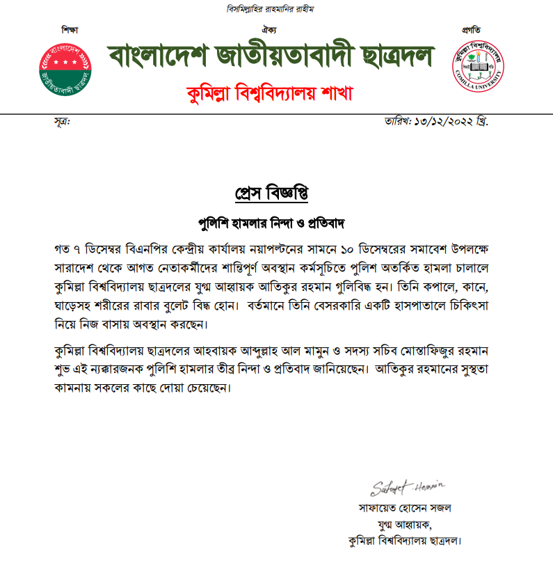 প্রেস বিজ্ঞপ্তিতে বলেন, গত ৭ ডিসেম্বর বিএনপির কেন্দ্রীয় কার্যালয় নয়াপল্টনের সামনে ১০ ডিসেম্বরের সমাবেশ উপলক্ষে সারাদেশ থেকে আগত নেতাকর্মীদের শান্তিপূর্ণ অবস্থান কর্মসূচিতে পুলিশ অতর্কিত হামলা চালালে আতিকুর রহমান গুলিবিদ্ধ হন। তিনি কপালে, কানে, ঘাড়েসহ শরীরে রাবার বুলেটে বিদ্ধ হোন। বর্তমানে তিনি বেসরকারি একটি হাসপাতালে চিকিৎসা নিয়ে নিজ বাসায় অবস্থান করছেন।
